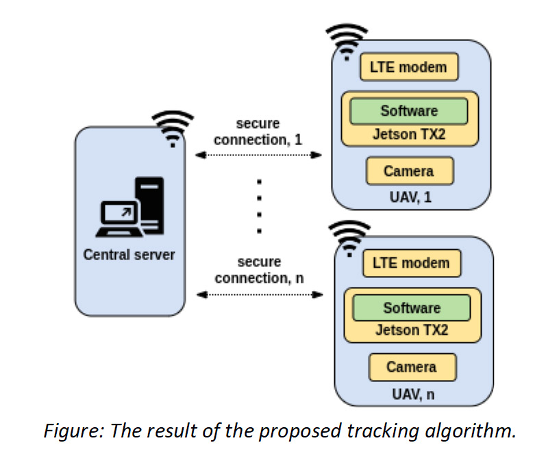 Drones and all mobile units connect to the Cloud Server using modems with SIM cards for 3G, 4G, 5G mobile phone networks. The on-board computer connects the drone (or mobile unit) using a VPN tunnel and a unique ID.