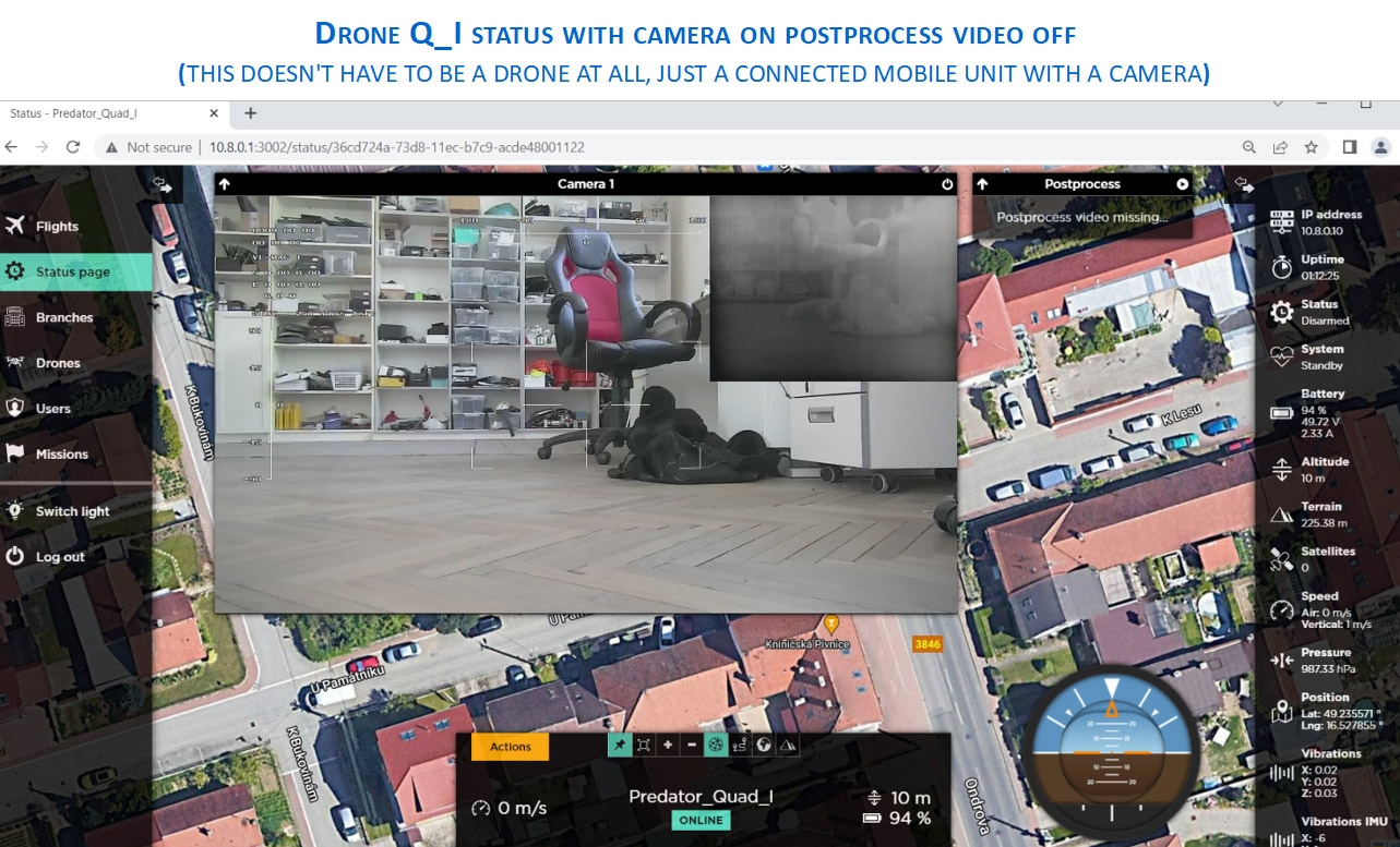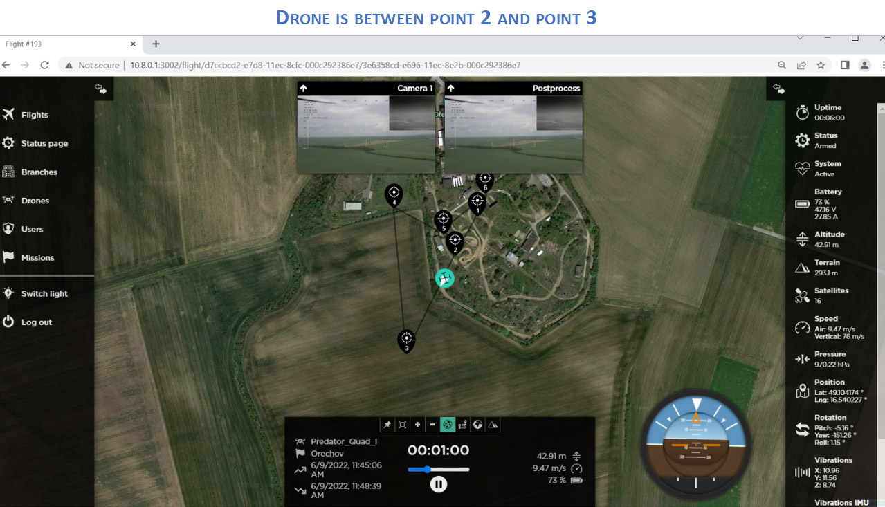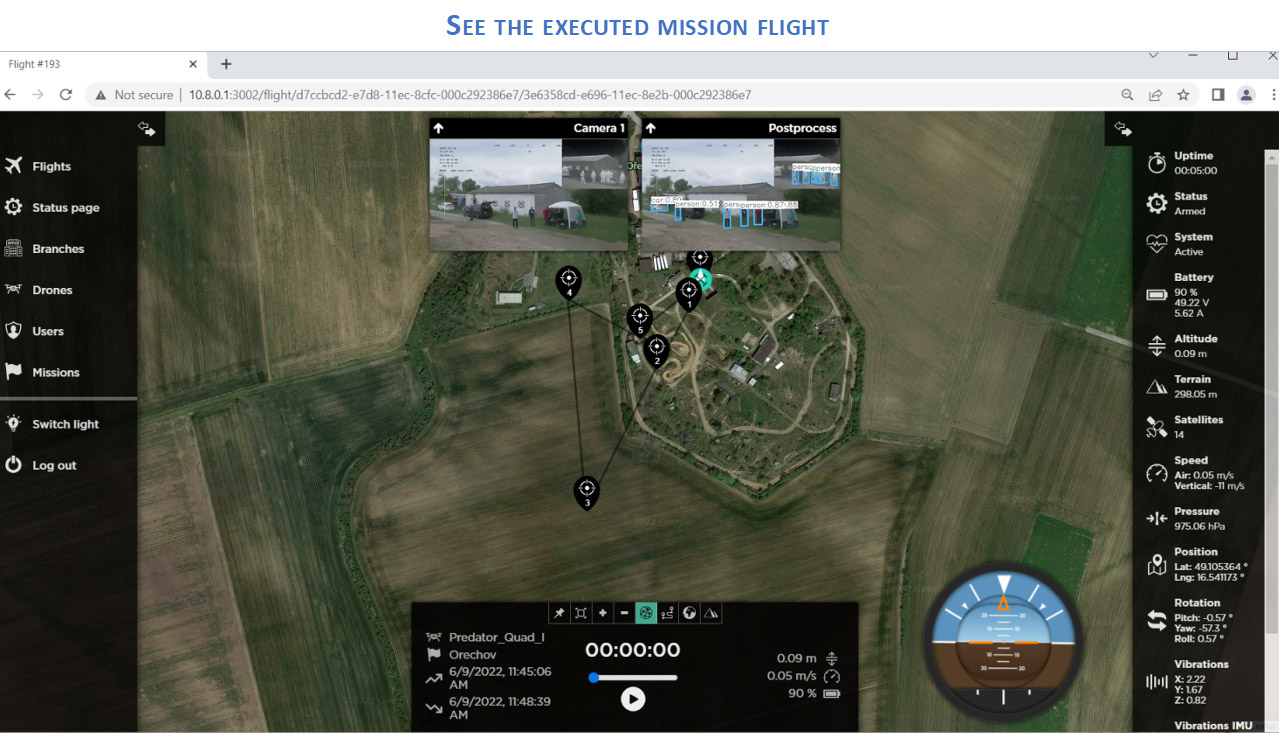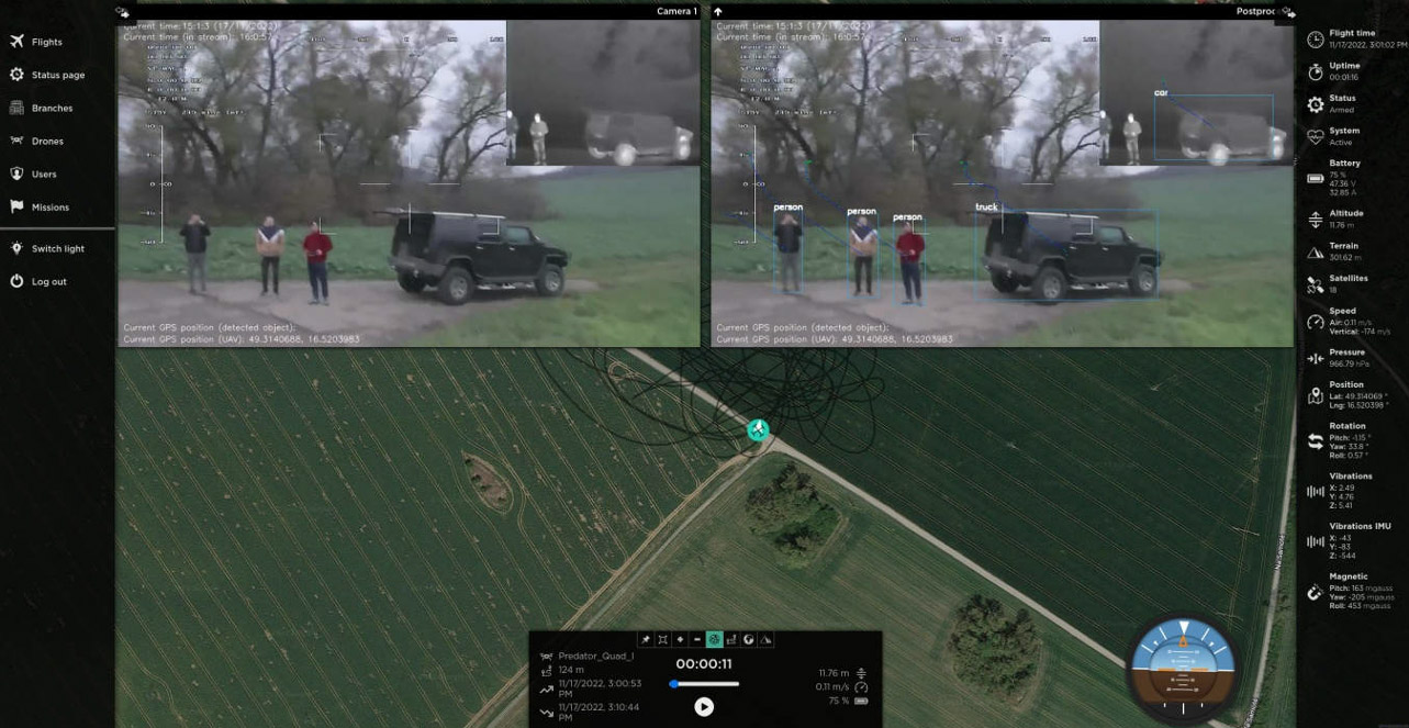 All telemetry data is transferred to the cloud, allowing the operator to track where the drone is located on the map, its status, battery life, and much more. It is also possible to transmit the image from the drone's camera (on the left side of the image) and at the same time, the operator is shown the same image processed by artificial intelligence, which allows it to detect and identify objects according to the learned database (on the right side of the image).