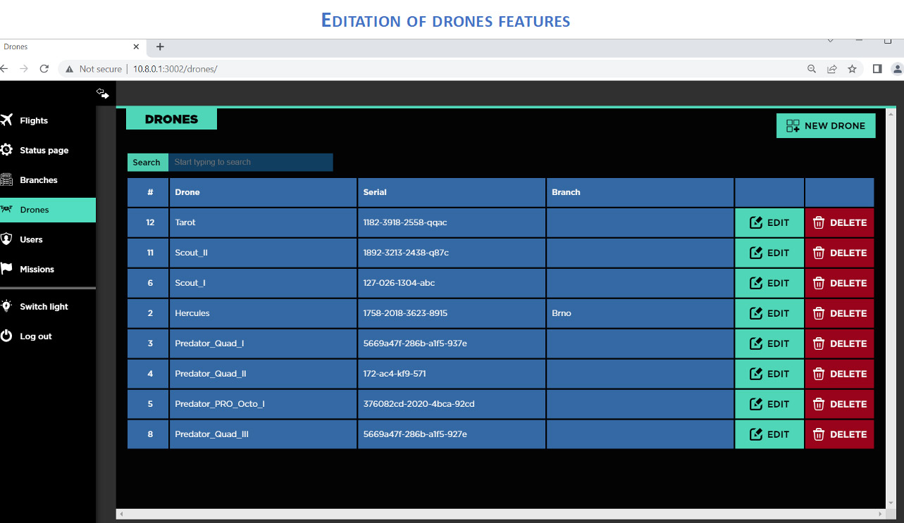 Individual drone settings such as the number of cameras, the drone’s name and the group the drone belongs to are again set in the Cloud Server. The drone ID is entered into the Cloud Server by an authorized employee. Only then can the drone be connected to the Cloud Server. The ID is intended for each drone in production and is unique.
