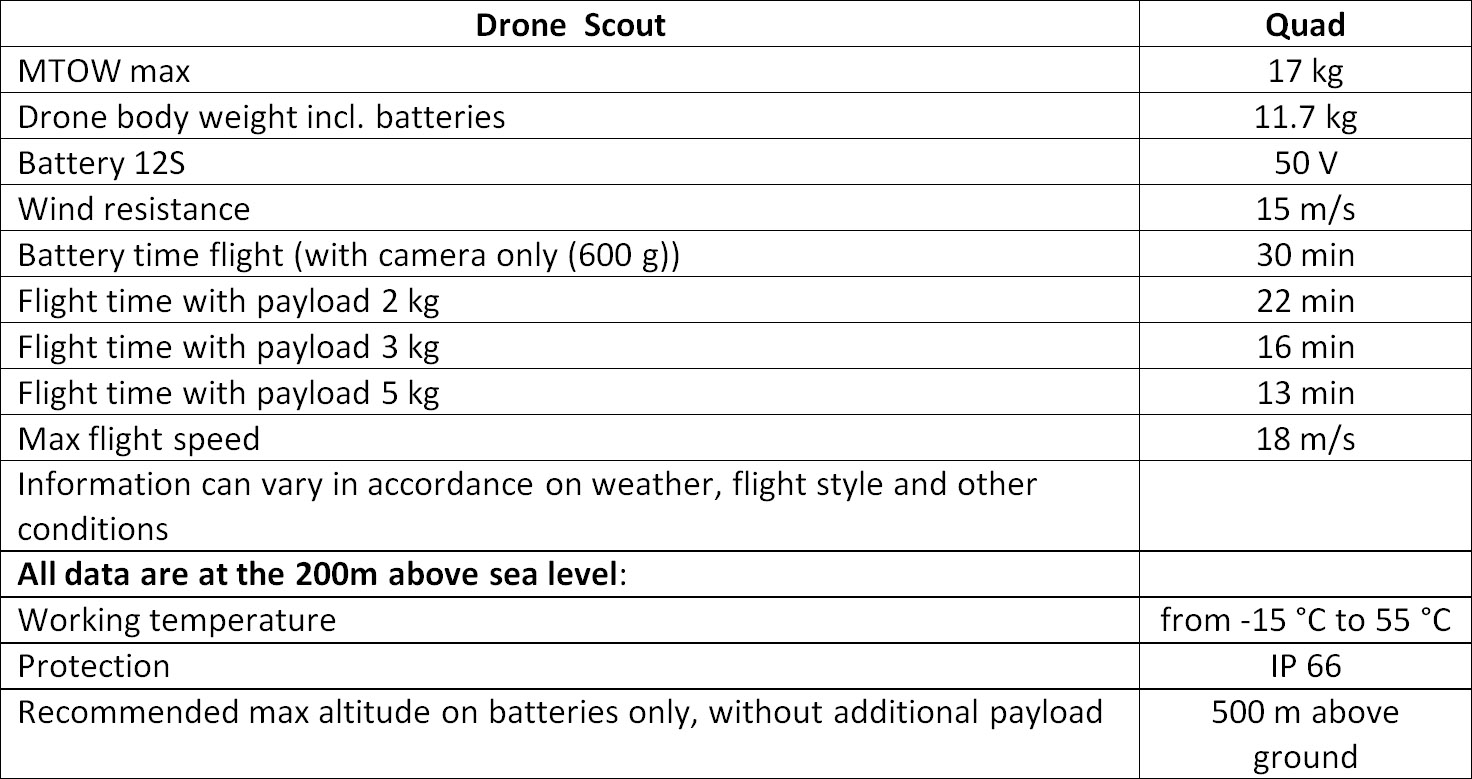 Scout is the ultimate multipurpose Remotely Operated Aerial Vehicle for commercial use. Its four enlarged highly powered rotors were designed to enable the Pilot in Command to fly for an extended amount of time with various medium payloads. Thanks to Scout modular quick release Picatiny standard system, there is no limit to the amount of payload that can be used. Payload operated can be up to 4kg. Due to high battery capacity (10Ah/50V), users can transport payload to a long distance. Drone construction is extremely durable, and all components are military grade. Drone hood is made from Kevlar composite.