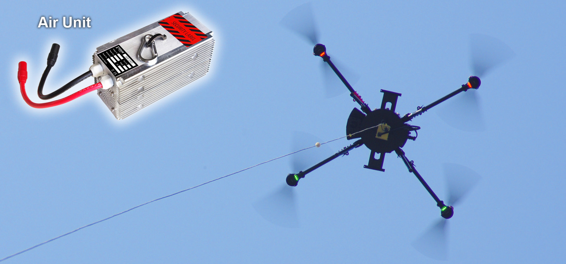 The Tethered Station is equipped with a cable (for powering and one (or two, if applicable) optical fibre single node and winch, which allows you to launch the drone up to 49 or 100 m or more according of clients order (depending on the type of drone and its load capacity). The cable powers the drone motors and at the same time, using an internal system, recharges the batteries in the second branch. The drone can therefore fly for a virtually unlimited time.